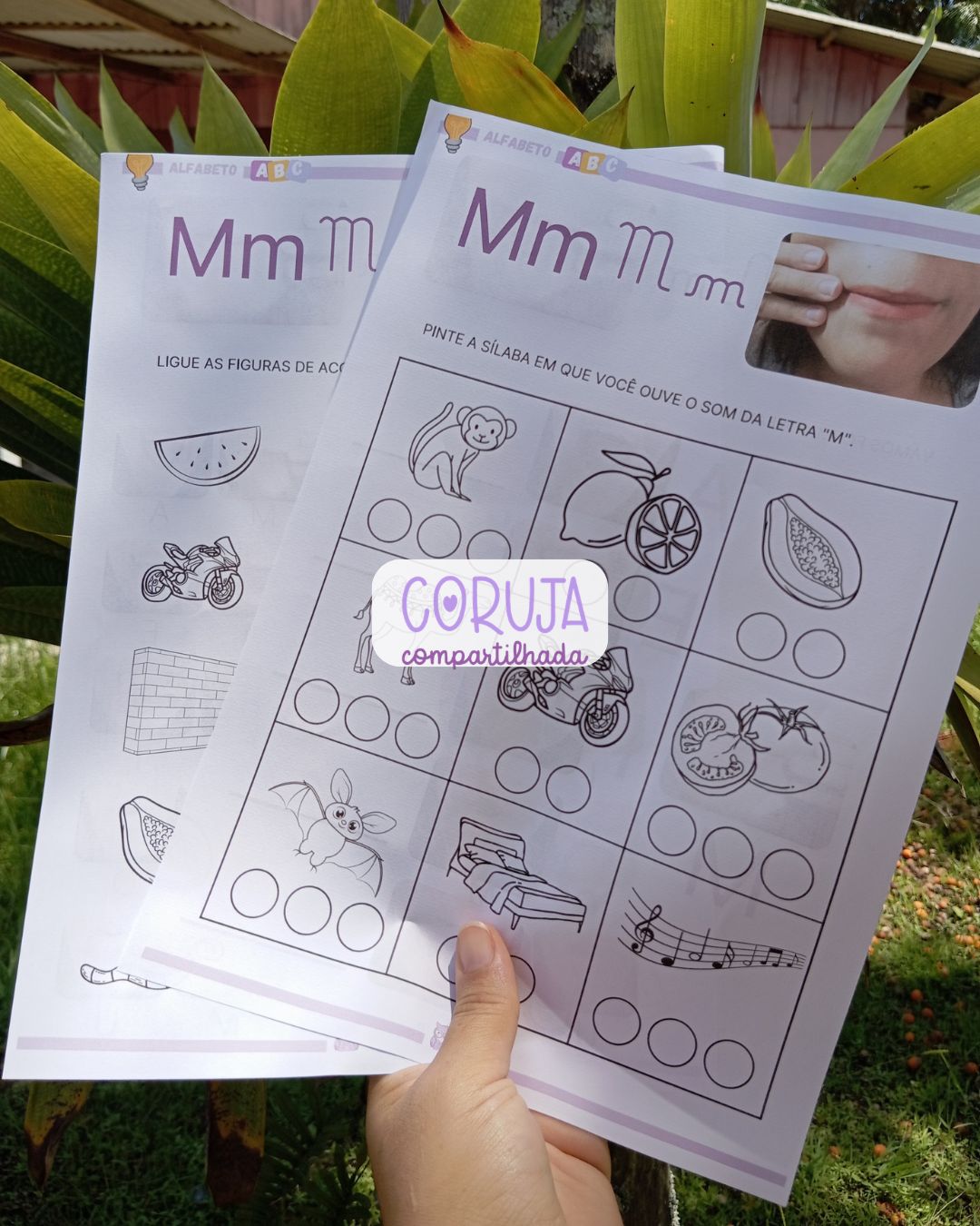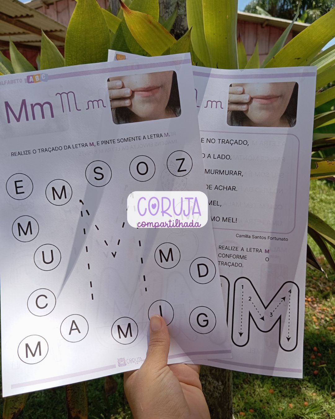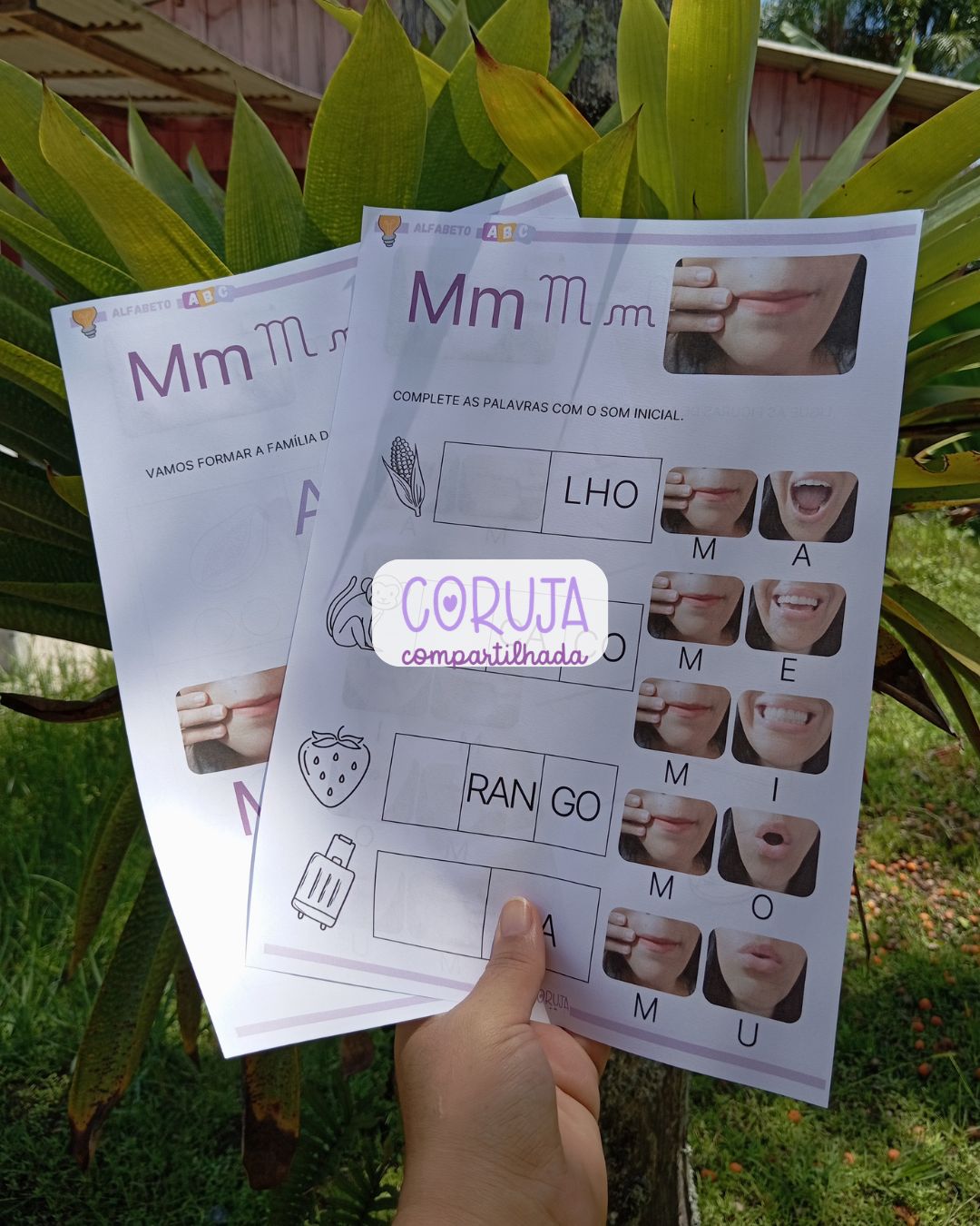 Além disso, o material proporciona uma introdução à família silábica da letra M, fortalecendo a consciência fonêmica e contribuindo para o desenvolvimento da leitura e da escrita de forma gradual e estruturada.