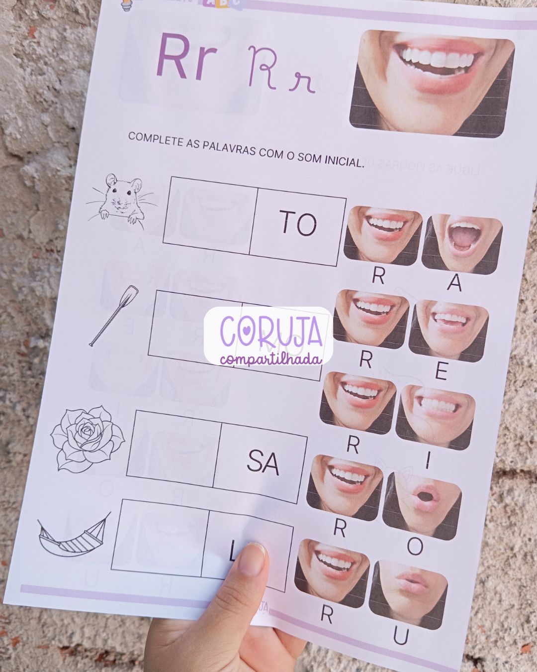 Além disso, o material proporciona uma introdução à família silábica da letra R, fortalecendo a consciência fonêmica e contribuindo para o desenvolvimento da leitura e da escrita de forma gradual e estruturada.