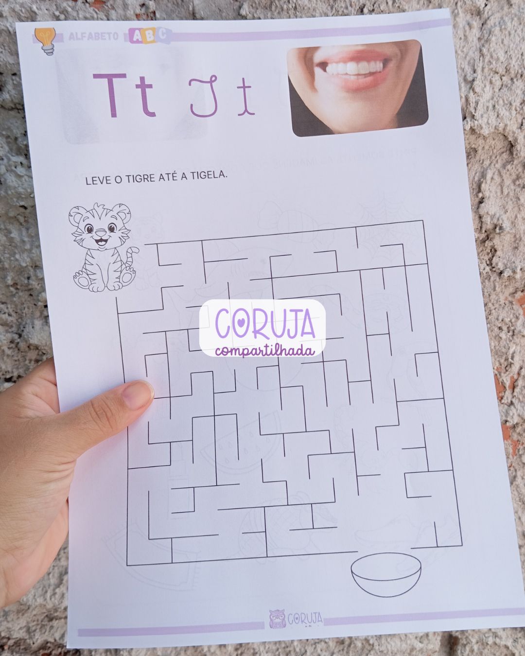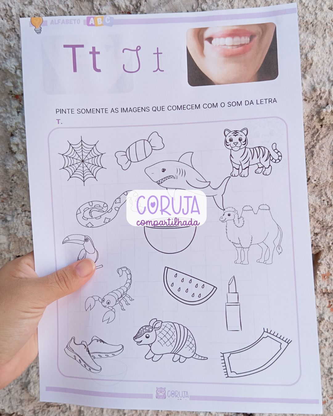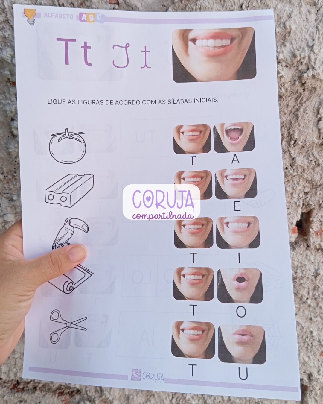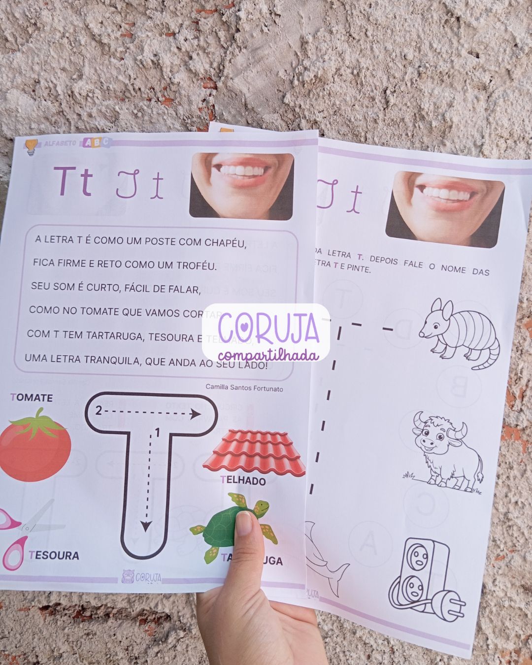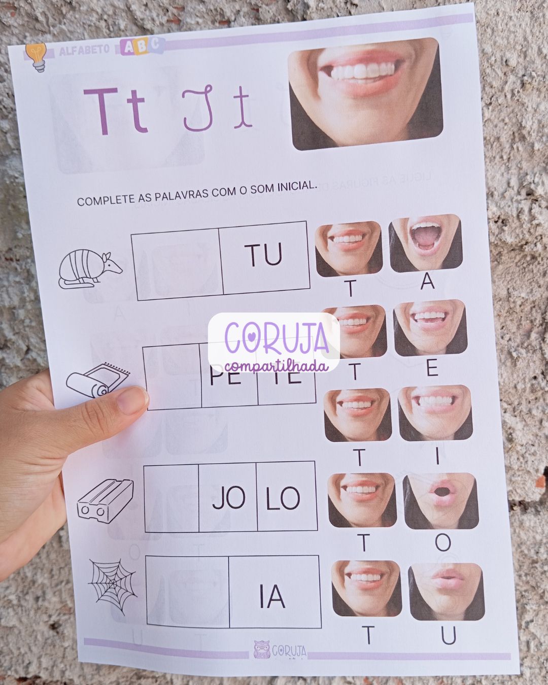 Além disso, o material proporciona uma introdução à família silábica da letra T, fortalecendo a consciência fonêmica e contribuindo para o desenvolvimento da leitura e da escrita de forma gradual e estruturada.