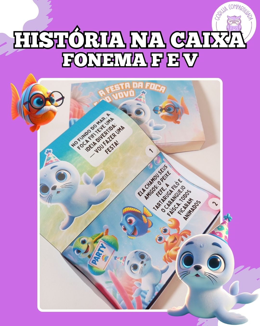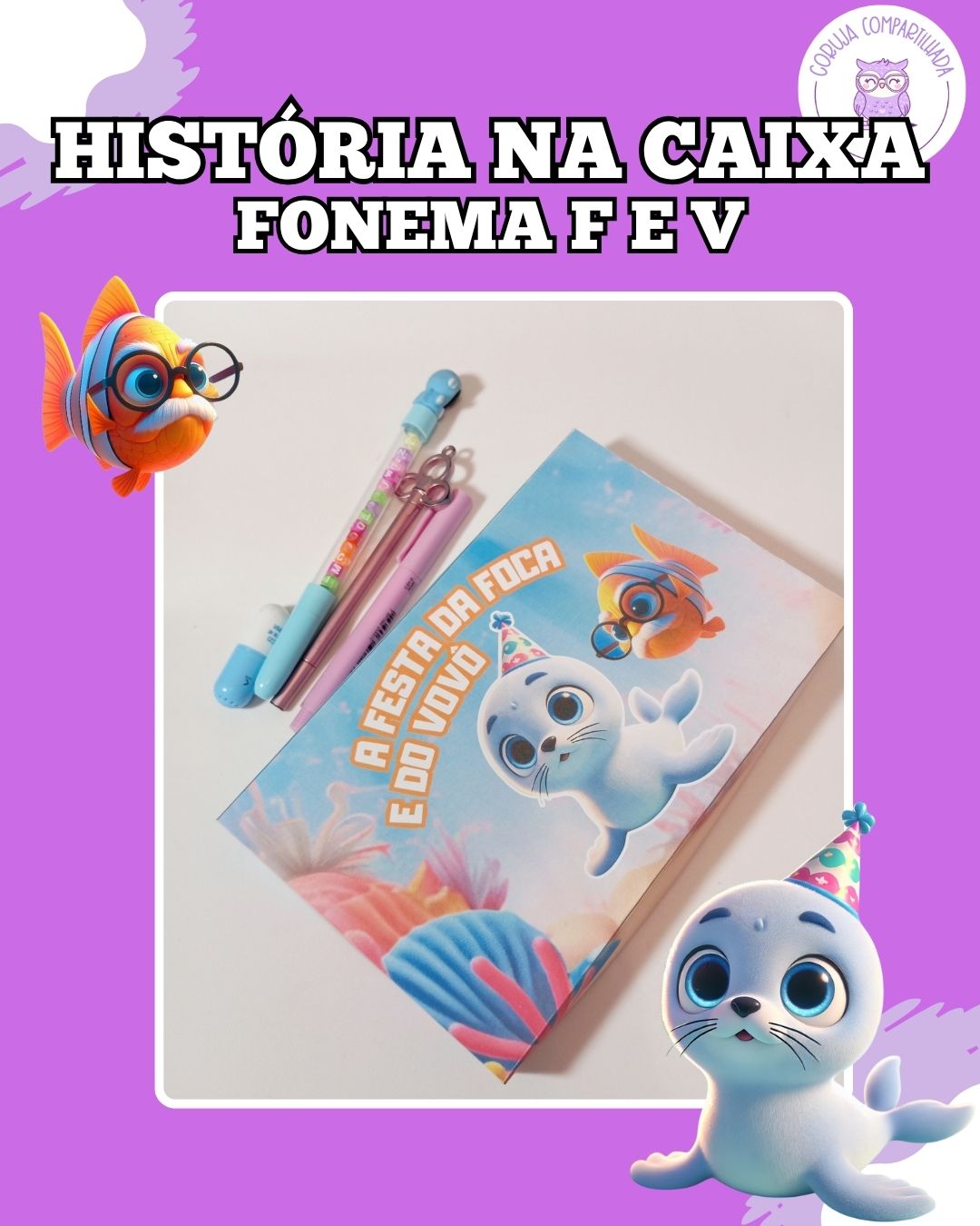 Descrição: A história na caixa “A FESTA DA FOCA E DO VOVÔ” aborda os sons, traçado e família silábica dos fonemas F e V. Além disso, acompanha 20 atividades para trabalhar com a família da letra F e V. O material é totalmente em PDF, pronto para impressão.